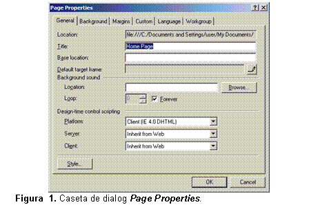 1.       In modul de afisare Page, se executa clic-dreapta pe pagina si din meniul contextual se selecteaza optiunea Page Properties. Apare caseta de dialog Page Properties (vezi fig. 1).