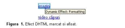 1.         Se selecteaza elementul de pagina ce va fi animat, se deschide meniul Format si se selecteaza optiunea Dynamic HTML Effects. Pe ecran se afiseaza bara instrumentelor DHTML Effects (vezi figura 2).