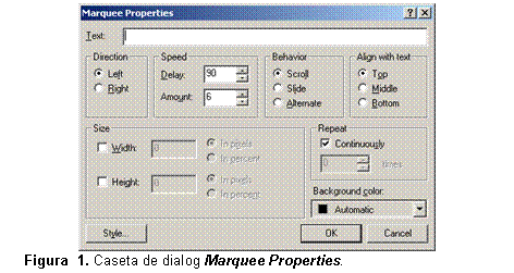 2.         In meniul Insert se indica optiunea Component si se selecteaza comanda Marquee. Pe ecran se va afisa caseta de dialog Marquee Properties (vezi fig. 7).