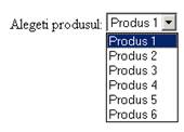 4. Drop-down box - utilizata pentru a prezenta vizitatorului o lista de optiuni pentru alegere. Campul este similar cu un grup de butoane radio, dar ocupa mai putin spatiu. De asemenea, acest tip de camp permite configurarea pentru selectarea a una sau mai multor optiuni in acelasi timp.
