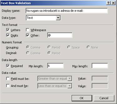 Pentru datele care necesita validare se poate stabili si tipul de date colectate. De exemplu, pentru colectionarea unui numar de carte de credit se poate crea o caseta text care accepta numai numere si semnul '-', celelalte caractere fiind invalidate. De asemenea, se poate cere un numar minim sau maxim de caractere pentru un anumit camp.