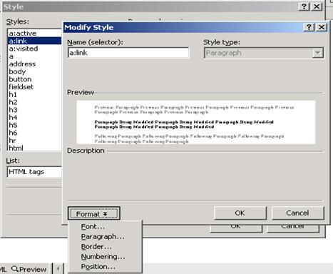 Pentru stilurile CSS se pot modifica tag-urile de baza ale HTML (h1=Heading 1, h2, p=Paragraf, li=lista, etc.) prin crearea de clase pentru tag-uri. Pentru aceste elemente se poate modifica tipul fontului, optiunile la nivel de paragraf, tipul si culoarea bordurii si a umplerii, tipul de numerotare si tipul bulinelor (pentru liste), si pozitia elementului fata de text sau in cadrul textului. Cum este si normal, se pot defini si elemente sau clase CSS noi, utilizand butonul New si optiunea pusa la dispozitie de User-defined styles. De exemplu, modificam tag-ul "a" (hyperlink) pentru ca toate hyperlink-urile sa fie de culoare verde, fara nici un efect. Rezultatul este crearea unui stil nou, care poate fi observat atat in User-defined styles cat si in fereastra HTML, sectiunea Style. Adaugam un nou stil CSS, prin redefinirea tag-ului a:hover (efectul obtinut prin pozitionarea mouse-ul deasupra unui hyperlink), iar in noul tag redefinim de exemplu, atat tipul si stilul fontului cat si culoarea acestuia. Rezultatul obtinut il putem vedea in fereastra Preview.