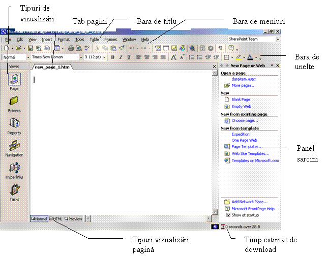 Ceea ce se poate vedea in fereastra principala a FrontPage depinde de tipul de vizualizare aleasa (Pagina, Foldere, Rapoarte, Navigare, Hyperlink-uri, Sarcini) |