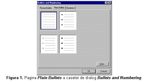 o Pentru a utiliza simbolurile standard de marcare, cum ar fi cercurile sau patratele, selectati eticheta Plain Bullets (vezi fig. 4), alegeti simbolul de marcare dorit si apoi executati clic pe butonul OK.