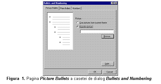 o Pentru a folosi simboluri personale de marcare, selectati eticheta Picture Bullets (vezi fig. 5) si alegeti optiunea Specify picture. Executati clic pe butonul Browse pentru a localiza si selecta imaginea pe care vreti s-o folositi. Pentru a reveni in pagina, executati clic pe OK.