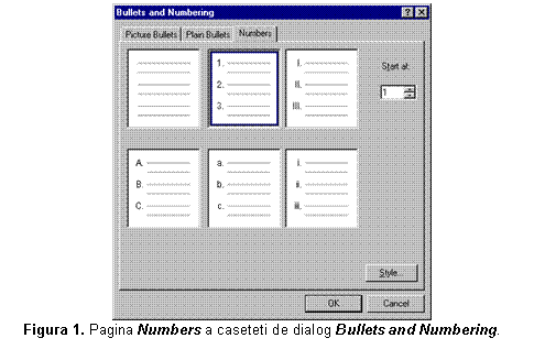 2. Deschideti meniul Format si selectati optiunea Bullets and Numbering. In caseta de dialog Bullets and Numbering, selectati eticheta Numbers (vezi fig. 6).