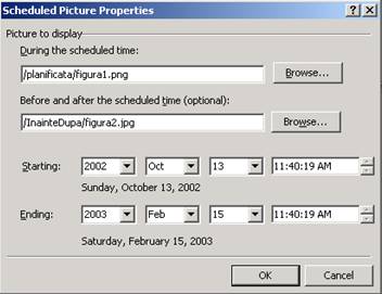 Pentru astfel de componente adaugate se selecteaza data si ora de inceput a planificarii precum si data si ora de final a planificarii, impreuna cu imaginea sau pagina care trebuie sa apara in interiorul intervalului si cu cea care trebuie sa apara in afara intervalului. Imaginile sau paginile pot fi selectare din interiorul site-ului propriu sau dintr-o adresa web oarecare.