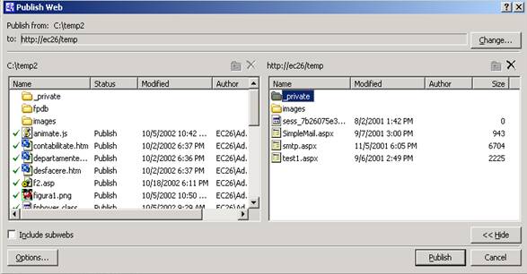 5. la aparitia casetei de dialog din figura urmatoare, site-ul web afisat in lista din stanga este pregatit de publicare in web-ul afisat in lista din dreapta. Locatiile From (sursa) si To (destinatie) apar deasupra fiecarei liste si sub bara de titlu.