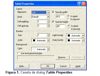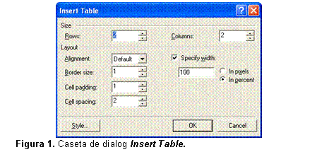 Folosind optiunea Insert Table din meniul Table puteti crea un tabel prin specificarea proprietatilor sale, cum ar fi numarul de linii si coloane, latimea tabelului, alinierea, grosimea bordurilor si spatierea celulelor.