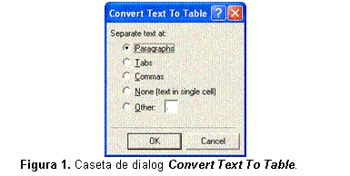 Daca deja ati introdus textul pe care vreti sa-l puneti intr-un tabel, acesta poate fi usor convertit in tabel atata timp cat textul contine caractere de separare care vor indica modul de repartizare pe coloane si linii. Cand aceasta conditie este indeplinita, se selecteaza textul de convertit, se deschide meniul Table, se indica optiunea Convert si se selecteaza comanda Text To Table. In caseta de dialog Convert Text To Table se precizeaza separatorul si apoi se executa clic pe OK.
