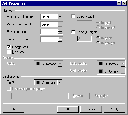 De asemenea, puteti redimensiona celule selectate prin precizarea inaltimii si latimii lor folosind controalele casetei de dialog Cell Properties (vezi fig. 14, pag. 16). Dimensiunile pot fi stabilite in pixeli sau ca peocentaj din marimea tabelului. La redimensionare, se va tine cont de urmatoarele: