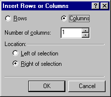 Selectati o coloana, deschideti meniul Table, indicati optiunea Insert si selectati comanda Rows or Columns. Apare caseta de dialog Insert Rows or Columns (vezi fig.16), avand optiunea Colums selectata.