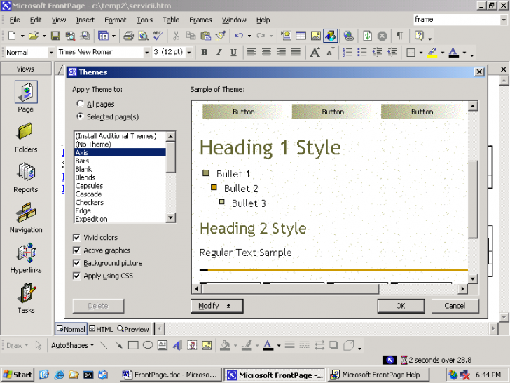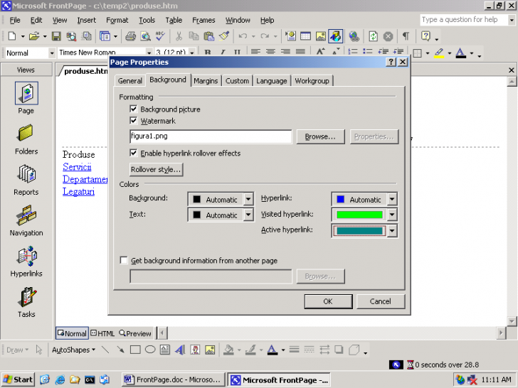 Culori, imagini si sunete             In momentul selectarii culorii pentru o anumita pagina, FrontPage afiseaza cea mai apropiata paleta de culori pentru pagina, in concordanta cu tem