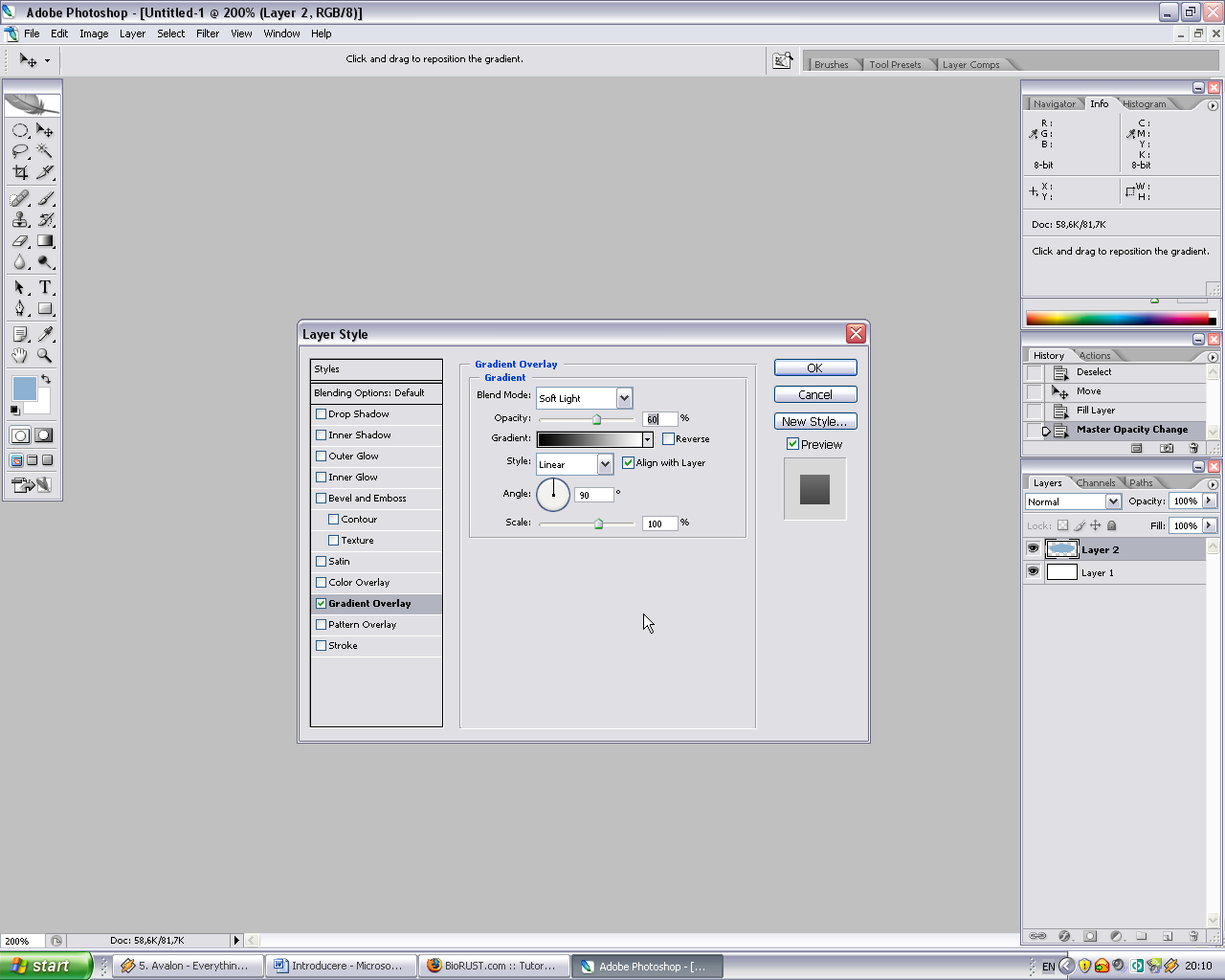 Photoshop - Cum se… face un ecran LCD? Pasul 1. Creati un document nou de orice dimensiune(eu am optat pentru 200x85 pixeli) si umpleti fundalul cu orice culoare, gradient sau tipar doriti. Eu am folosit un gradient
