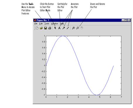 Dupa generarea unui grafic (plot), se pot face schimbari si prelucrari ale graficului cu interfata grafica Plot Editor. Figura urmatoare ilustreaza principalele facilitati ale ferestrei grafice si ale interfetei Plot Editor.