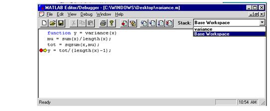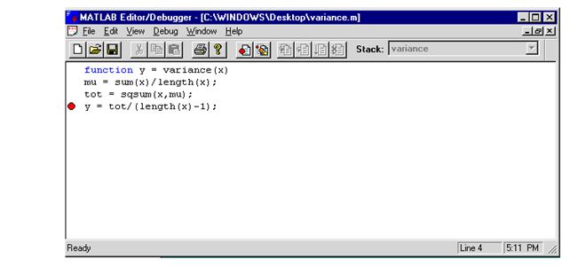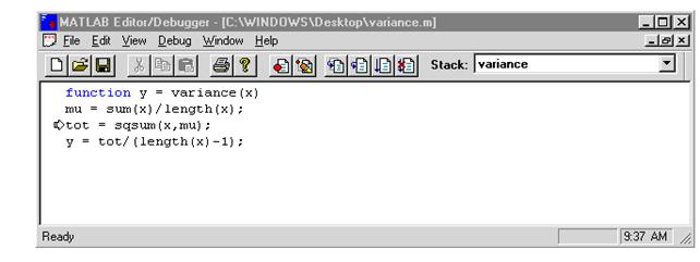 Daca fisierul .m (adica variance.m) a fost creat cu editorul MATLAB si suntem in fereastra Editor/Debugger, se continua din acest punct.
