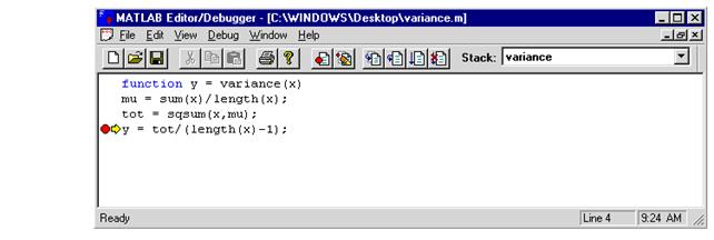 O data eroarea gasita se selecteaza Quit Debugging si se termina executia programului. Se sterge breakpoint din sqsum si se pune un breakpoint la linia 4 din variance.m, dupa care rulam din nou: