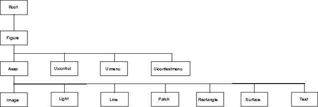 Ierarhia este bazata pe interdependentele dintre diferitele obiecte grafice. De exemplu, pentru trasarea unui obiect linie, MATLAB utilizeaza un obiect de tip axe pentru orientarea si furnizarea unui sistem de referinta liniei. Obiectul de tip axe are nevoie la randul sau de o fereastra grafica pentru afisarea liniei.