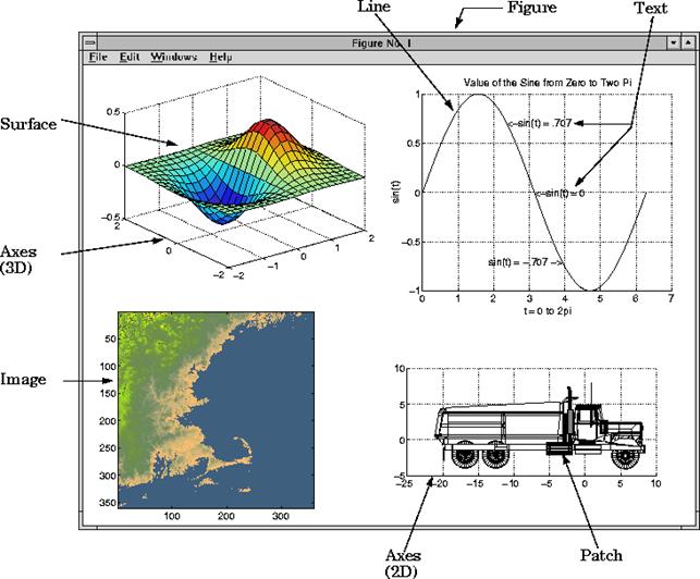 Obiectele de tip figura sunt ferestre individuale pe ecranul radacina pe care MATLAB-ul afiseaza graficele. Nu exista limita pentru numarul de ferestre grafice (decat cele datorate limitelor calculatorului). Toate obiectele figura sunt "copii" ai radacinii si celelalte obiecte grafice sunt descendenti ai figurilor.