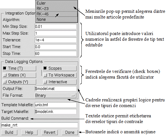 Obiectele Uicontrol pot fi utilizate in diferite combinatii pentru construirea unor ecrane de control si a unor ferestre de dialog. In exemplul urmator sunt prezentate astfel de combinatii: meniuri "pop-up", ferestre de tip text editabile, ferestre de verificare (check boxes), butoane, text static, cadre etc.