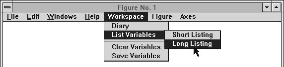 Imaginea urmatoare arata partea de sus a unei figuri MS-Windows care are definite trei meniuri de top Uimenu (intitulate Workspace, Figure, si Axes). Doua niveluri de submeniuri sunt vizibile in meniul Workspace.