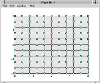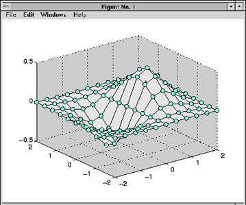 [x,y] = meshgrid([-2:.4:2]);Z = x.*exp(-x.^2-y.^2);fh=figure('Position',[350 275 400 300],'Color','w');ah=axes('Color',[.8 .8 .8],'XTick',[-2 -1 0 1 2], 'YTick',[-2 -1 0 1 2]);sh = surface('XData',x,'YData',y,'ZData',Z, 'FaceColor',get(ah,'Color')+.1, 'EdgeColor','k','Marker','o', 'MarkerFaceColor',[.5 1 .85]);