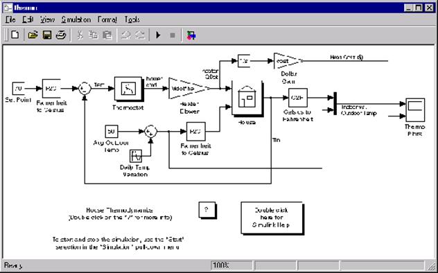 Programul modeleaza sistemul termodinamic al unei case folosind o reprezentare simpla. Temperatura de referinta este setata la 70 grade Fahrenheit (aprox. 21 grade Celsius). Temperatura din casa este influentata de temperatura exterioara, care poate fi variata sub forma sinusoidala (amplitudine 15 grade F, temperatura de baza 50 grade F), variatie care simuleaza fluctuatiile temperaturii din exterior din timpul zilei.