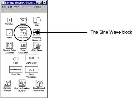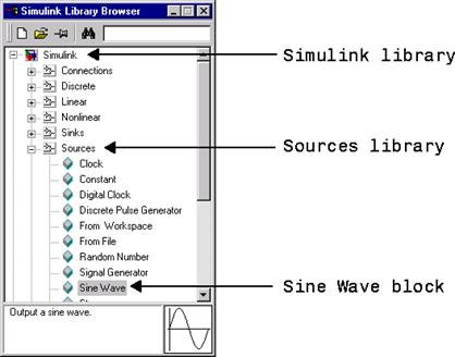 Pentru copierea blocului Sine Wave se utilizeaza Browser-ul de bibiloteci: intai se expandeaza arborele de biblioteci (prin click pe nodul Simulink si apoi click pe nodul surse) astfel incat sa fie afisate blocurile din biblioteca de surse. Apoi se selecteaza blocul Sine Wave (click).