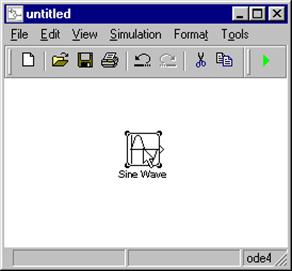 La pasul urmator se trage (tinand apasat butonul din stanga al mouse-ului) blocul Sine Wave din browser si i se da drumul in fereastra modelului. Simulink va face o copie a blocului Sine Wave in punctul indicat.