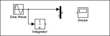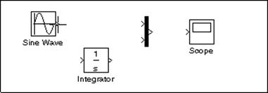 Modelul prezentat in continuare integreaza un sinus si afiseaza atat rezultatul cat si unda sinusoidala de la intrare. Schema bloc a modelului este urmatoarea: