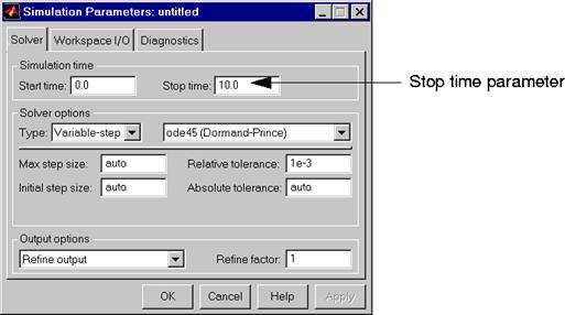 1. Setam parametrii simularii prin alegerea submeniului Parameters din meniul Simulation. In fereastra de dialog care apare vom seta parametrul Stop time la 0 (valoare implicita).