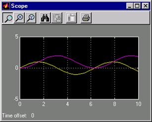Pentru aceasta se deschide mai intai blocul osciloscopului (Scope), pentru a vizualiza evolutia marimilor modelului. Pastrand fereastra osciloscopului deschisa se va seta Simulink pentru rularea unei simulari timp de 10 secunde. Pentru aceasta, parcurgem urmatorii pasi: