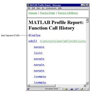 Raportul apelarilor de functii. Acest raport afiseaza secventa exacta a functiilor apelate. Pentru a vizualiza acest raport, trebuie startat profiler-ul cu optiunea -history.