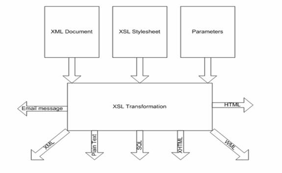 Dupa cum se poate vedea, motorul XSL primeste ca intrare un fisier XML (poate fi bineinteles si un html), un fisier cu stilul de formatare (XSL Stylesheet) si eventuali parametrii pentru rulare. Rezultatele pot fi foarte diferite, de la "texte simple", la "texte cu un anumit inteles" (xml, sql,etc)