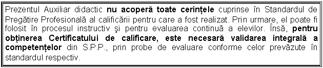De aceea, materialele de invatare cuprinse in prezentul auxiliar didactic pot fi utilizate si la instruirea elevilor in calificarile enumerate mai sus.