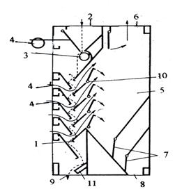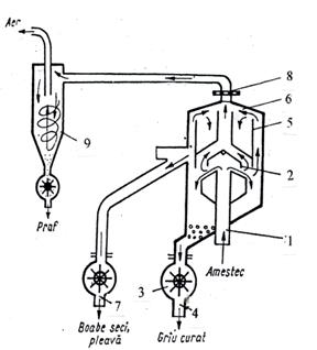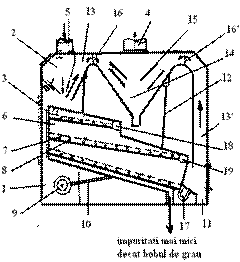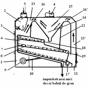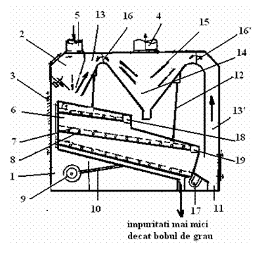 evacuare grau curatit: 12 - lamele elastice; 13, 13' - canal de circulatie a aerului cu