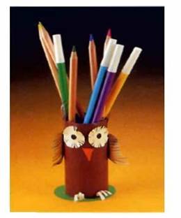 3. Se imbraca rola cu fasia taiata, potrivindu-se perfect la unul din capetele rolei, apoi se capseaza la ambele capete. Daca nu avem capsator se poate lipi hartia pe rola. Am realizat asftel corpul bufnitei.
