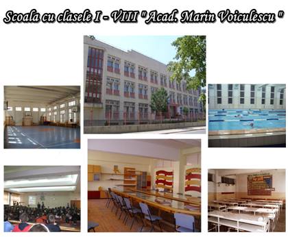 Scoala cu clasele I-VIII "Acad. Marin Voiculescu" dispune de un local modern cu o baza materiala ce include: 23 sali de clasa, laboratoare de chimie, de biologie, 2 cabinete de informatica, cabinet psihologic, biblioteca si sala de lectura (9800 volume carti),cabinet medical, baza sportiva (sala de sport si bazin de inot), o sala de festivitati cu 343 de locuri. Aici isi desfasoara activitatea 72 de cadre didactice,( 25 de invatatori si 47 de profesori), 20 personal didactic auxiliar si nedidactic.