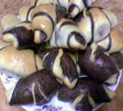 Rahatul trebuie pudrat cu faina sau zahar farin ca sa nu se mai lipeasca.As propune in loc sa umplem cornuletele cu rahat ,sa le umplem cu nuca macinata,albus de ou si zhar ca la cozonac iar pe deasupra sa le undem cu miere de albine si ca decor sa punem pe suprafata maro ciocolata razuita alba,iau ce suprafata galben-aurie ciocolata razuita neagra.
