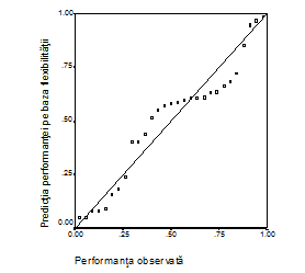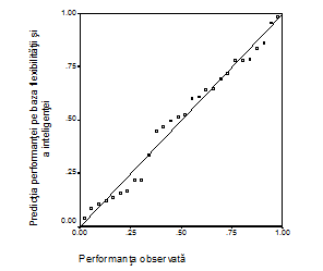 Pe graficele de mai jos se poate observa ca predictia performanteleor este mai precisa daca luam in calcul atat inteligenta cit si felxibilitatea cognitiva. Deasemenea putem sublinia faptul ca flexibilitatea cognitiva este un predictor mai eficient decat inteligenta, desi inteligenta este utilizat mult mai des in predictia performantelor cognitive.