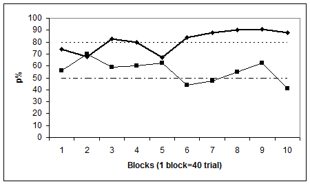 In aceasta simulare nu se mai poate invoca incapaciatea subiectilor de a calcula probabilitatile de cistig deoare ce aceste probabilitati puteau fi estimate pe baza experientelor anterioare. Analizand deciziile economice a subiectilor in cate 400 de decizii secventiale, am reusit sa surprindem gradul de adaptabilitate strategica al acestora. Figura urmatoare arata datele agregate ale modificarii strategiilor observate dealungul probelor.