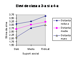Importanta acestor doi factori apare in mod evident in rezultatele obtinute de Harter in cercetarile sale ilustrate in figura. Aceasta cercetatoare i-a intrebat pe copii de clasa a 3-a, a 4-a, a 5-a si a 6-a, ce importanta acorda reusitei lor in cinci domenii si ce rezultate considera ca vor obtine in fiecare dintre ele. Ansamblul distantelor dintre aceste evaluari constituie distanta totala. Sa ne amintim ca o distanta mare lipsa increderii copilului in reusita sa in domenii importante pentru el. Copiii au mai fost intrebati daca cred ca ceilalti (parintii si colegii) ii plac asa cum sunt, ii trateaza drept persoane in toata firea sau ii considera drept importanti. Datele din figura sprijina ipoteza lui Harter. Din acest studiu reiese ca stima de sine a copiilor mici si mari este clar legata, in egala masura, de cei doi factori izolati de Harter. Sa observam insa ca o distanta mica nu constituie o garantie absoluta contra unei stime de sine reduse atunci cand copilul nu dispune de un suport social adecvat. La fel, o familie si un grup de colegi caldurosi si toleranti nu pot garanta o stima de sine ridicata a copilului atunci cand realizarile sale concrete sunt sub nivelul propriilor sale asteptari.
