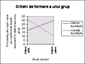 Ceea ce apreciaza copii la asemenea grupuri este faptul de a "impartasi o activitate". Daca veti intreba un copil ce anume leaga grupul din care face parte el va spune: jucam fotbal impreuna, sarim coarda, ne plimbam cu bicicleta etc. Este putin probabil ca el sa vorbeasca despre atitudini sau valori comune ca baza de formare a grupului sau de modul de functionare a grupului. Aceasta tendinta poate fi observata in figura. Sunt prezentate aici rezultatele unui studiu al lui Susan O'Brien si Karen Bierman (1988). Ele au cerut unui numar de copii de clasa a patra si a sasea sa vorbeasca despre diferitele grupuri ce existau in scoala lor si sa explice cand anume se poate vorbi despre existenta unui grup. Pentru copiii de clasa a patra, criteriul cel mai frecvent folosit este practicare unor activitati in comun. Pentru cei de clasa a sasea, criteriul principal este constituit de atitudinile comune. Aceste criterii diferite ilustreaza evolutia de la concret spre abstract in raporturile sociale.