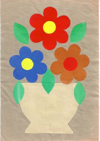 - decupati separat cele trei piese (vaza, floarea si frunza) pentru a obtine sabloane si conturati pe carton colorat vaza si cate flori doriti (cu aceasta tehnica va recomand doar trei flori, ca in imagine) si aplicati un colaj din hartie creponata mototolita. Cred ca ar iesi ceva superb !