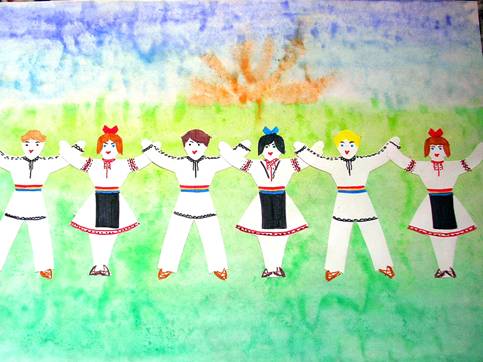 Hora . Se obtine prin aranjarea papusilor decupate una langa cealalta , cu mainile unite. Cand s-a obtinut o imagine de ansamblu a lucrarii , se pot lipi papusile.