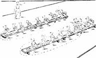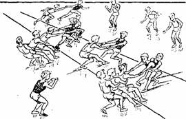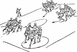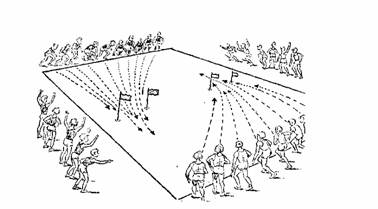 La semnal, echipele alearga inspre linia opusa si cauta sa ajunga c: repede si sa se alinieze inapoia acestei linii.