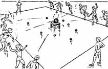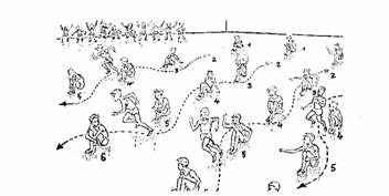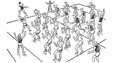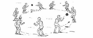 Jucatorii se impart in doua echipe egale si acestea se aseaza in linie, una in fata celeilalte, la o distanta de 10-12 m. Jucatorii se numeroteaza in continuare, astfel ca cei care au acelasi numar sa se gaseasca fata in fata.