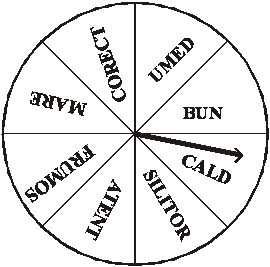 Material didactic: un disc de carton impartit in 8-10-12 parti egale, in care se vor scrie cuvinte care au antonime: prieten, cald, bun, atent, silitor, etc. In centrul discului se va fixa o sageata in pozitie orizontala.