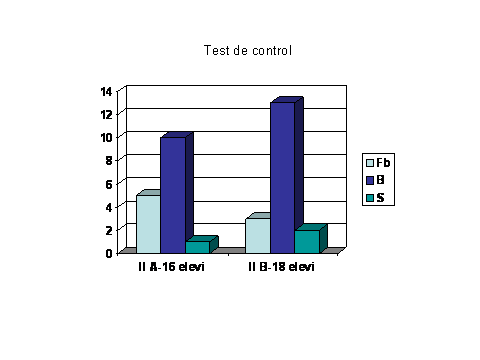 Dupa o perioada de cinci luni, urmarind obiectivele programei scolare, am realizat un test de control comun, atat la clasa experimentala, cat si la cea martor. Realizarea obiectivelor programei m-a determinat sa utilizez, in anumite situatii si strategiile didactice consacrate. Testul a avut urmatoarele obiective: