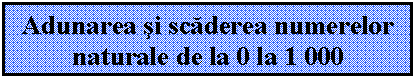 Stabilirea si utilizarea algoritmului de calcul Exercitii de adunare a numerelor naturale cu trecere peste ordin Operarea cu terminologia specifica Exercitii de scadere a numerelor naturale cu trecere peste ordin Recunoasterea situatiilor concrete sau a expresiilor care presupun efectuarea operatiilor de adunare sau scadere Analiza partilor componente ale unor probleme Rezolvarea de probleme care presupun efectuarea operatiilor de adunare / scadere Rezolvarea de exercitii care presupun aflarea unui numar necunoscut |
